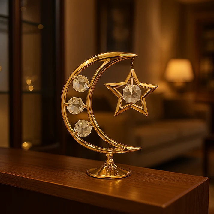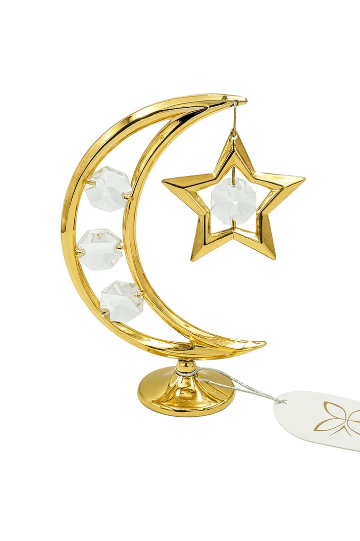 Maan & Ster Beeldje met Kristallen – 24K Verguld Breng een elementaire magie in huis met dit elegante maan en ster beeldje , verguld met 24-karaats goud en rijkelijk versierd met fonkelende kristallen. De maansikkel is prachtig afgewerkt met drie betrouwbare kristallen, terwijl de ster in het midden sierlijk bungelt en schittert bij elke lichtinval.