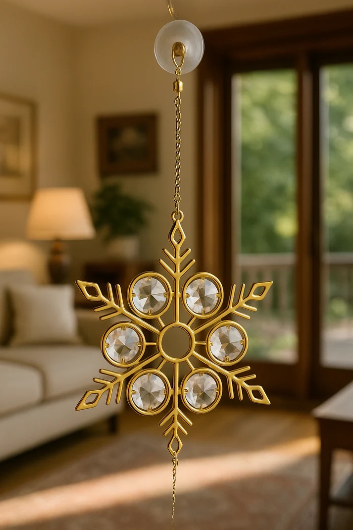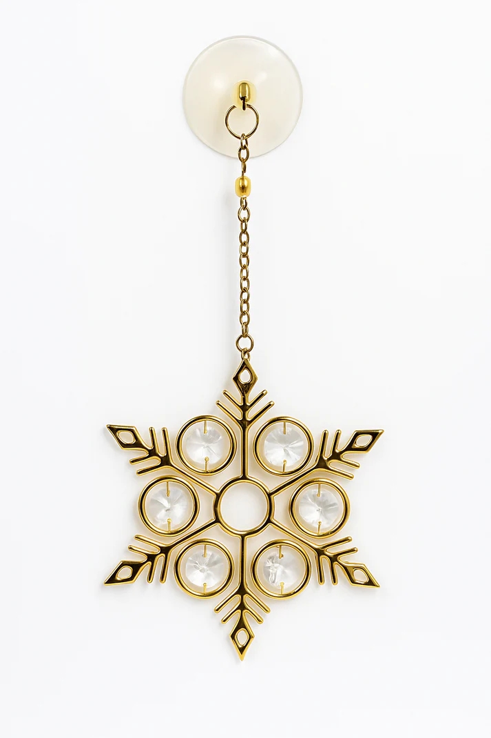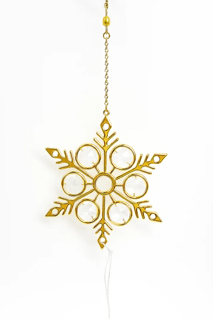 Sneeuwvlok Hanger met Kristallen – 24K Verguld Breng de warmte en magie van de winter in huis met deze prachtige sneeuwvlok hanger, verguld met 24-karaats goud en voorzien van zes sprankelende kristallen. Een verfijnd en elegant decoratiestuk dat schittert zodra het licht erop valt, perfect voor in de woonkamer, voor het raam of in de kerstboom.