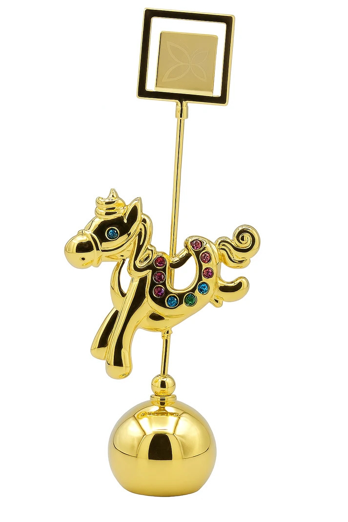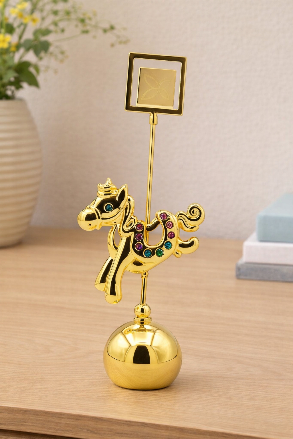 Deze prachtige fotohouder is verguld met 24-karaats goud en versierd met kleurrijke kristallen op het draaimolenpaardje. Het bolvormige voetje zorgt voor een stabiele basis en het bovenste clipje is ideaal voor het presenteren van een foto, kaartje of notitie. Perfect voor wie houdt van een unieke touch in huis of op kantoor.