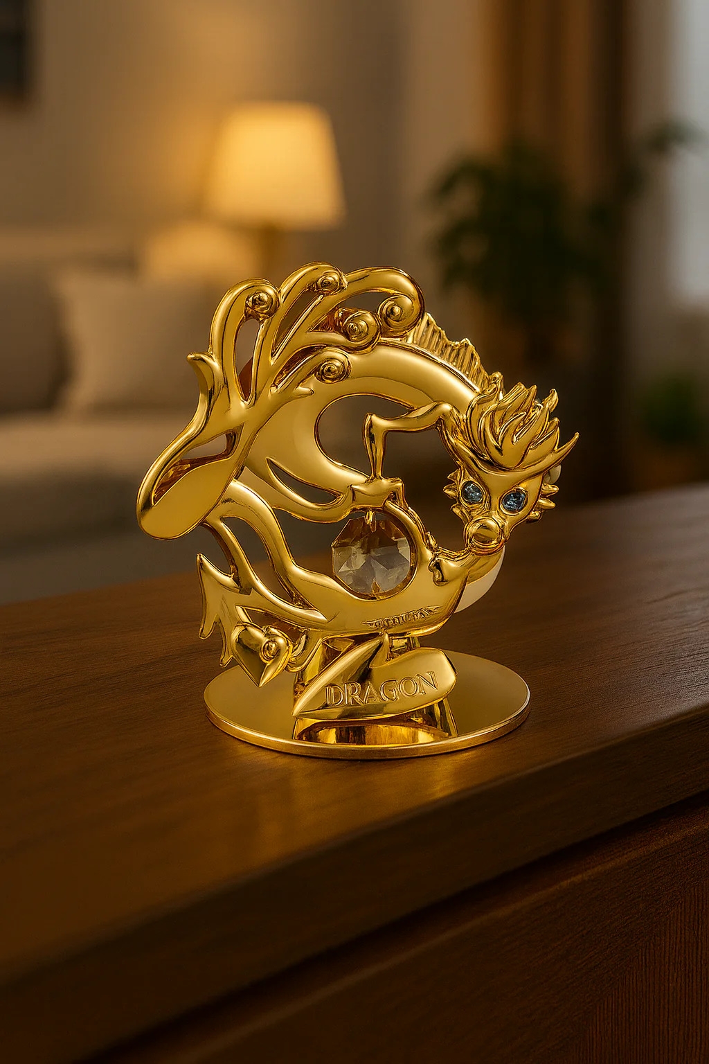 Laat je betoveren door deze ondeugend charmante gouden draak! Met zijn glinsterende blauwe oogjes, sierlijke staart en sprankelend Bohemia-kristal in zijn buik is hij een ware blikvanger. Perfect voor iedereen die houdt van een vleugje mystiek met een knipoog.