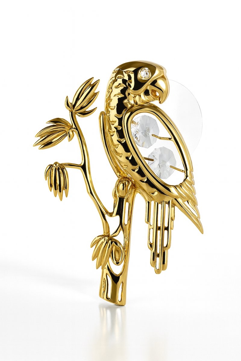 Breng een vleugje exotische elegantie in je interieur met deze schitterende 24K vergulde papegaai, bezet met fonkelende kristallen. Dankzij de sterke transparante zuignap bevestig je hem moeiteloos op een spiegel, kastdeur, raam of elke gladde ondergrond.