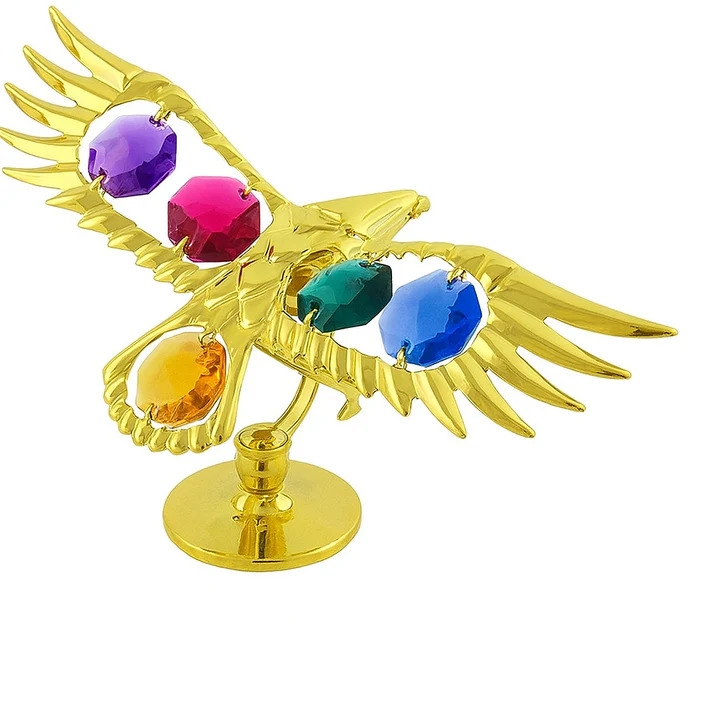 Een krachtige en sierlijke vergulde adelaar, prachtig uitgespreid in volle vlucht en rijkelijk versierd met kleurrijke kristallen in regenboogtinten. Een decoratief beeldje dat niet alleen luxe uitstraalt, maar ook symbool staat voor vrijheid, visie en kracht.