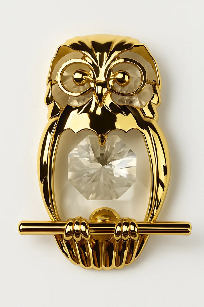 Geef elke ruimte een vleugje luxe, wijsheid en schittering met deze 24K vergulde kristallen uil, voorzien van een stevige zuignap waarmee je het beeldje eenvoudig bevestigt op vrijwel elk glad oppervlak. Ideaal voor spiegels, ramen, vitrinekasten, glazen deuren, badkamertegels of kledingkasten.