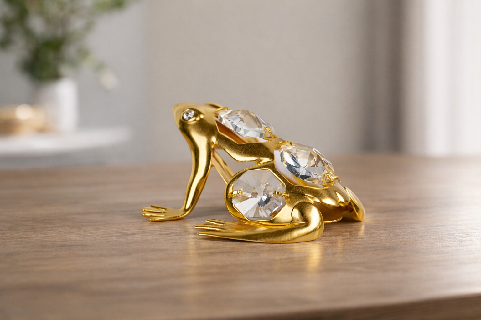 Breng een vleugje luxe en elegantie in je interieur met deze prachtige 24 karaat vergulde kikker, verfijnd afgewerkt met schitterende kristallen details. Dit unieke decoratiestuk straalt klasse en exclusiviteit uit en is een echte blikvanger op iedere kast, tafel of vensterbank.