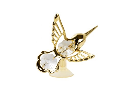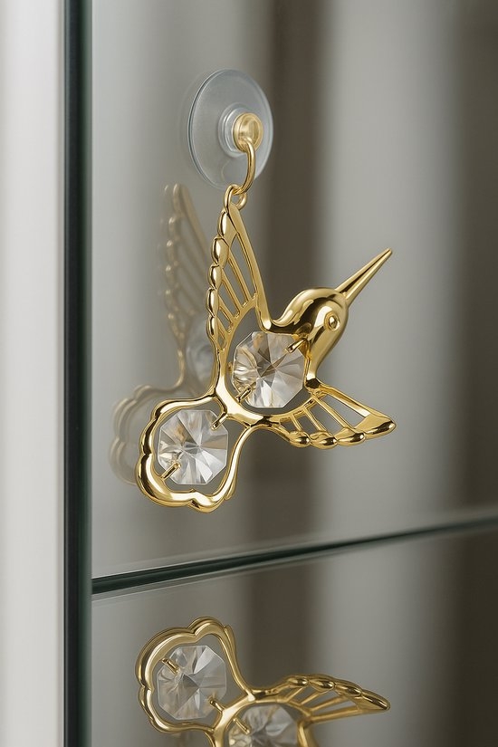 Breng een vleugje elegantie in huis met deze betoverende 24 karaat vergulde kolibrie, versierd met schitterende kristallen die het licht op een magische manier breken. Deze sierlijke eyecatcher is voorzien van een stevige transparante zuignap, waardoor je hem moeiteloos kunt bevestigen op een spiegel, glas, kastdeur, tegelwand of elk ander glad oppervlak.
