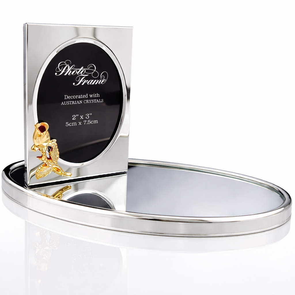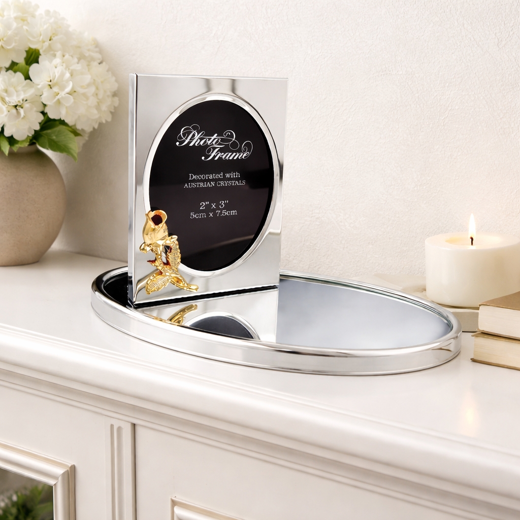De fotolijst staat op een spiegelend plateau, wat het geheel een extra chique en decoratief effect geeft. Perfect voor op een kast, dressoir of nachtkastje.