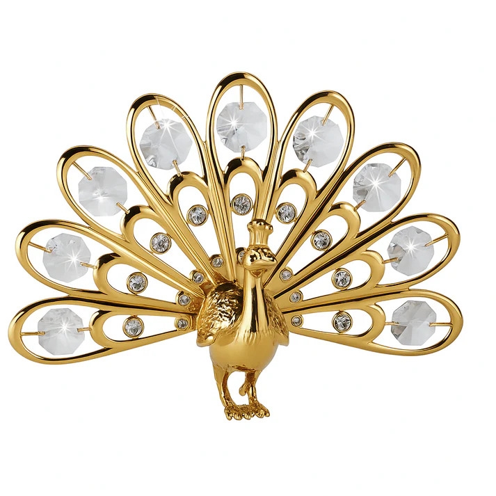 Laat je betoveren door de elegantie en pracht van deze vergulde pauw, rijkelijk versierd met prachtige Swarovski® kristallen . Deze kunstzinnige creatie van Crystal Temptations vangt de essentie van schoonheid en verfijning – perfect als luxe decoratie of uniek geschenk.