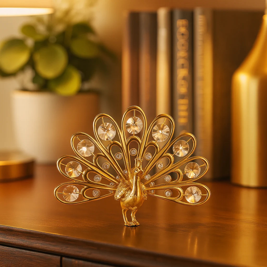 Het pauwbeeldje is zorgvuldig verguld met 24-karaats goud en beschikt over een waaier van fonkelende kristallen in de sierlijk uitgespreide staart. Elk detail straalt vakmanschap en klasse uit, waardoor dit stuk een echte eyecatcher is in elk interieur.