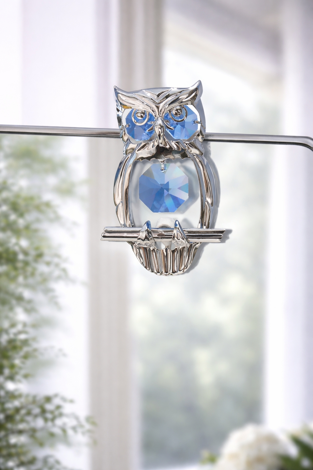 Breng wijsheid, rust en elegantie in huis met deze prachtige zilverkleurige uil, verfijnd afgewerkt met schitterende blauwe kristallen.